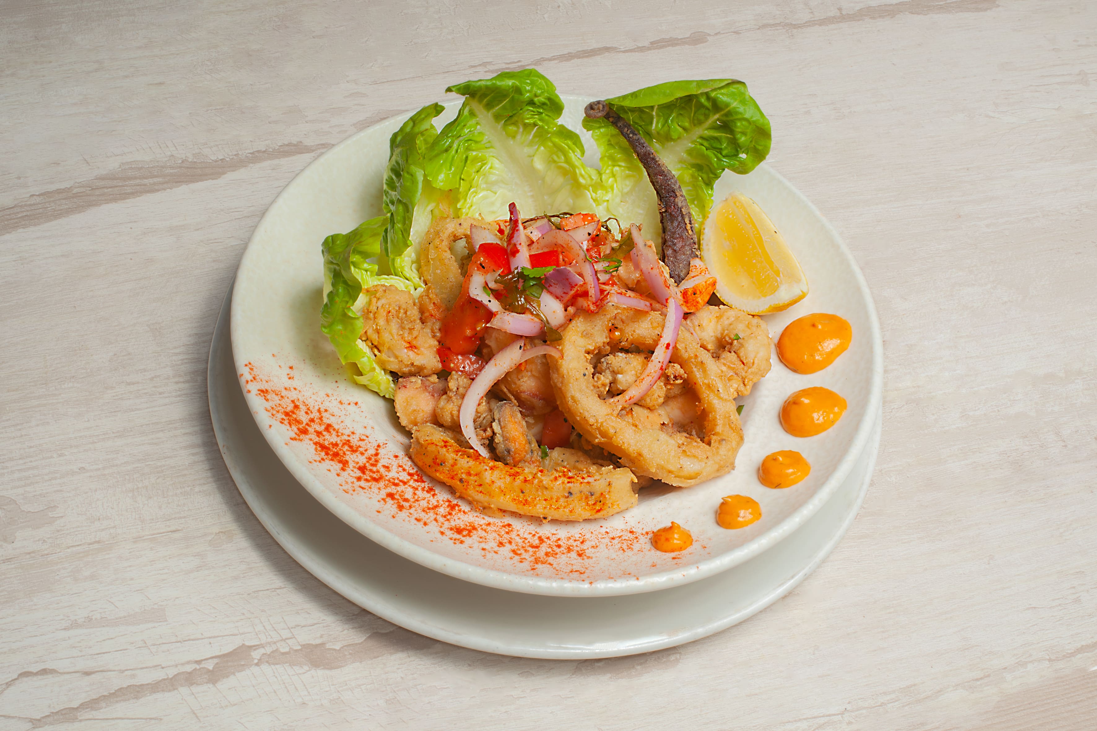 Fritura de gambas, mejillones, calamares, pulpo y puntilla. Acompañados de ensalada criolla y lechuga romana.