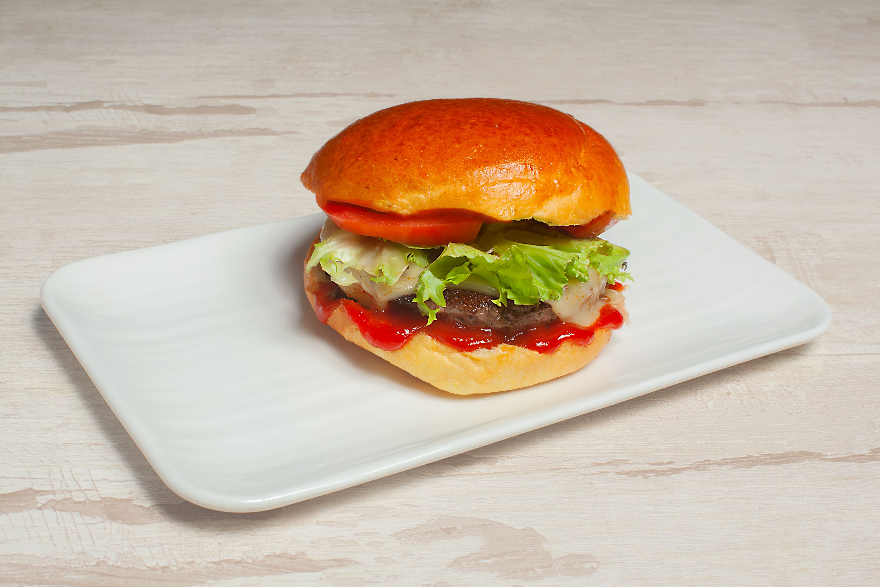 Con carne de buey, lechuga, tomate, cebolla cruda, queso Edam, bacon, pepinillo dulce y ketchup
