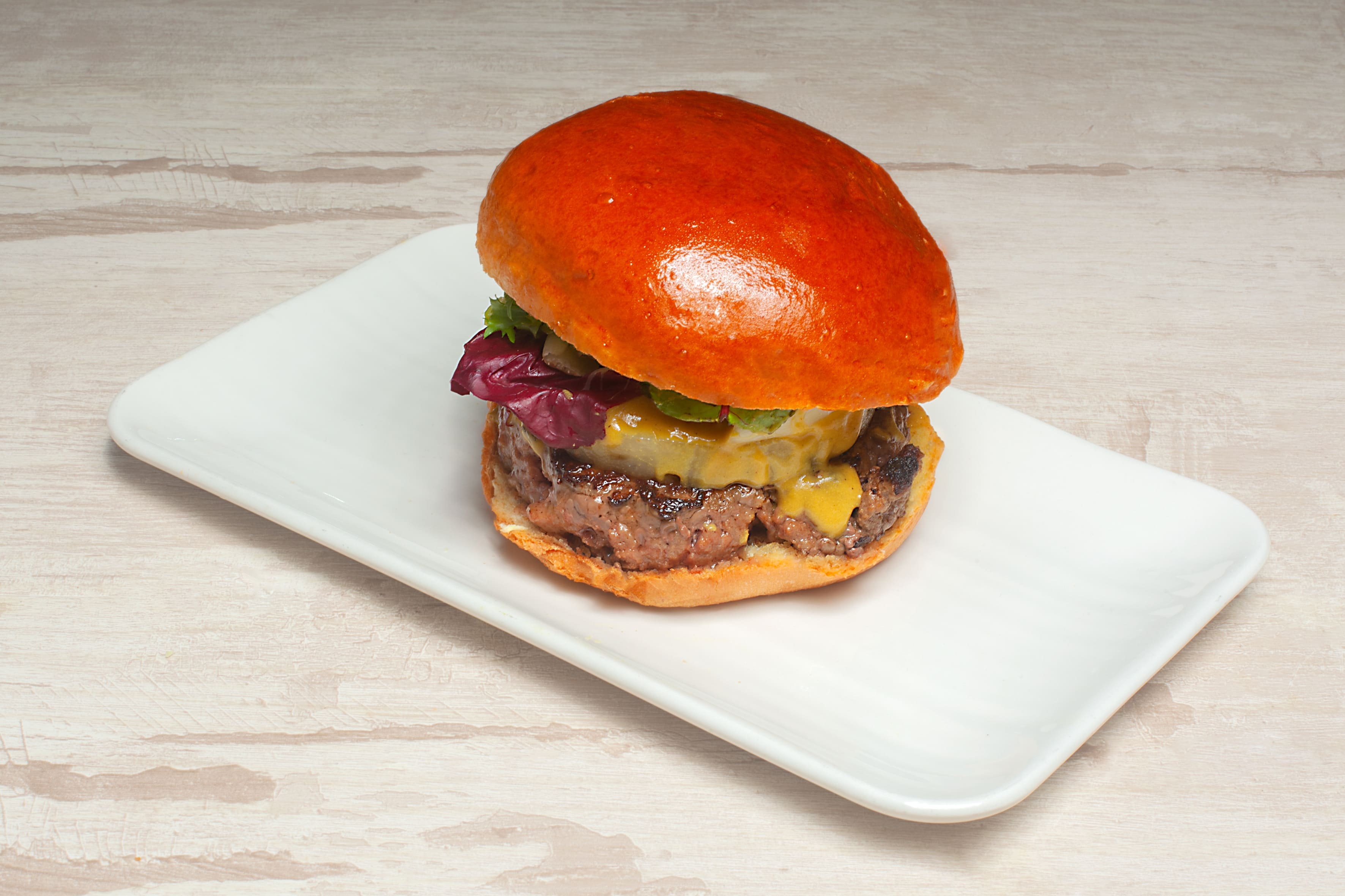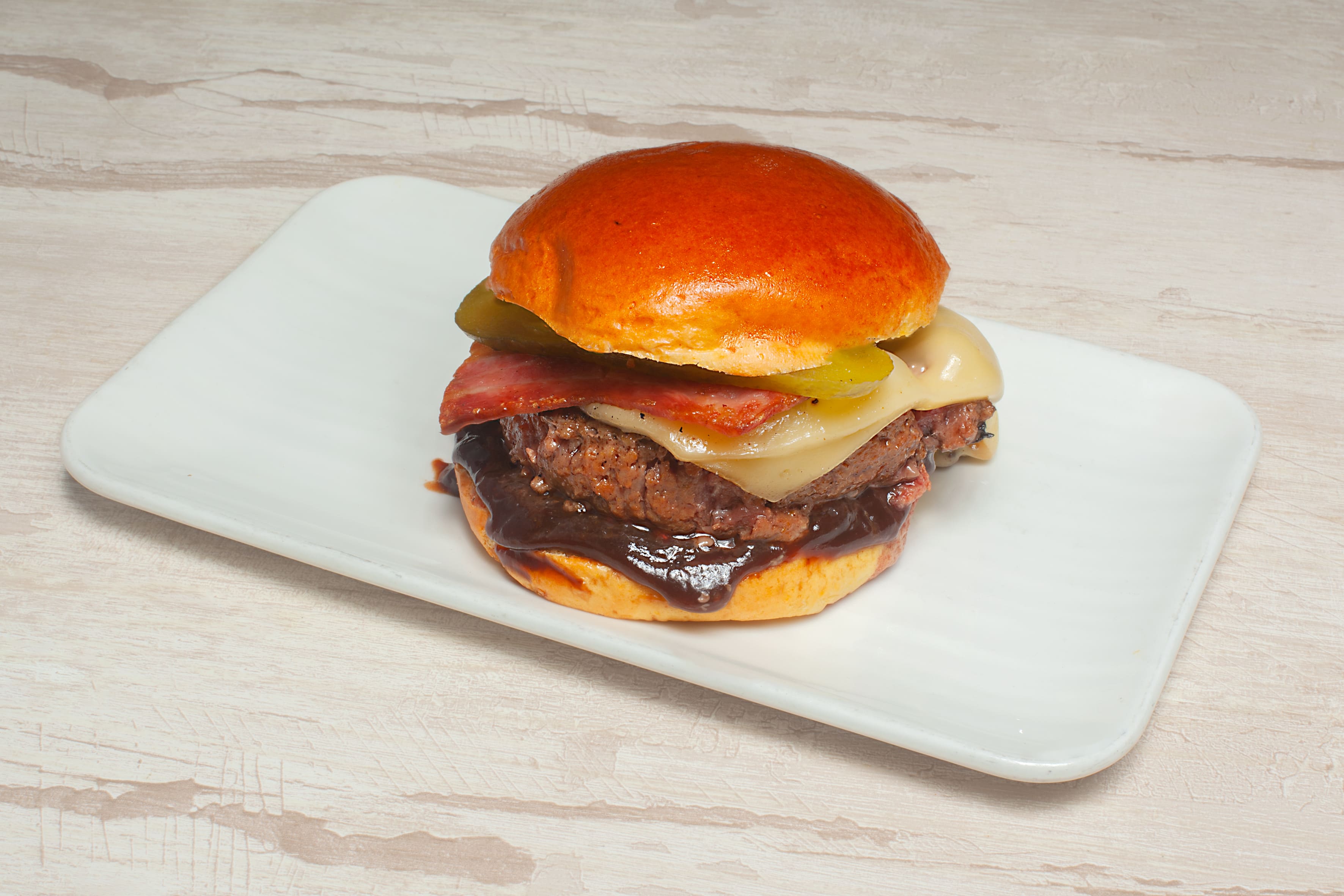Con carne de ternera, queso Edam, bacon, cebolla crujiente, pepinillo dulce, salsa barbacoa