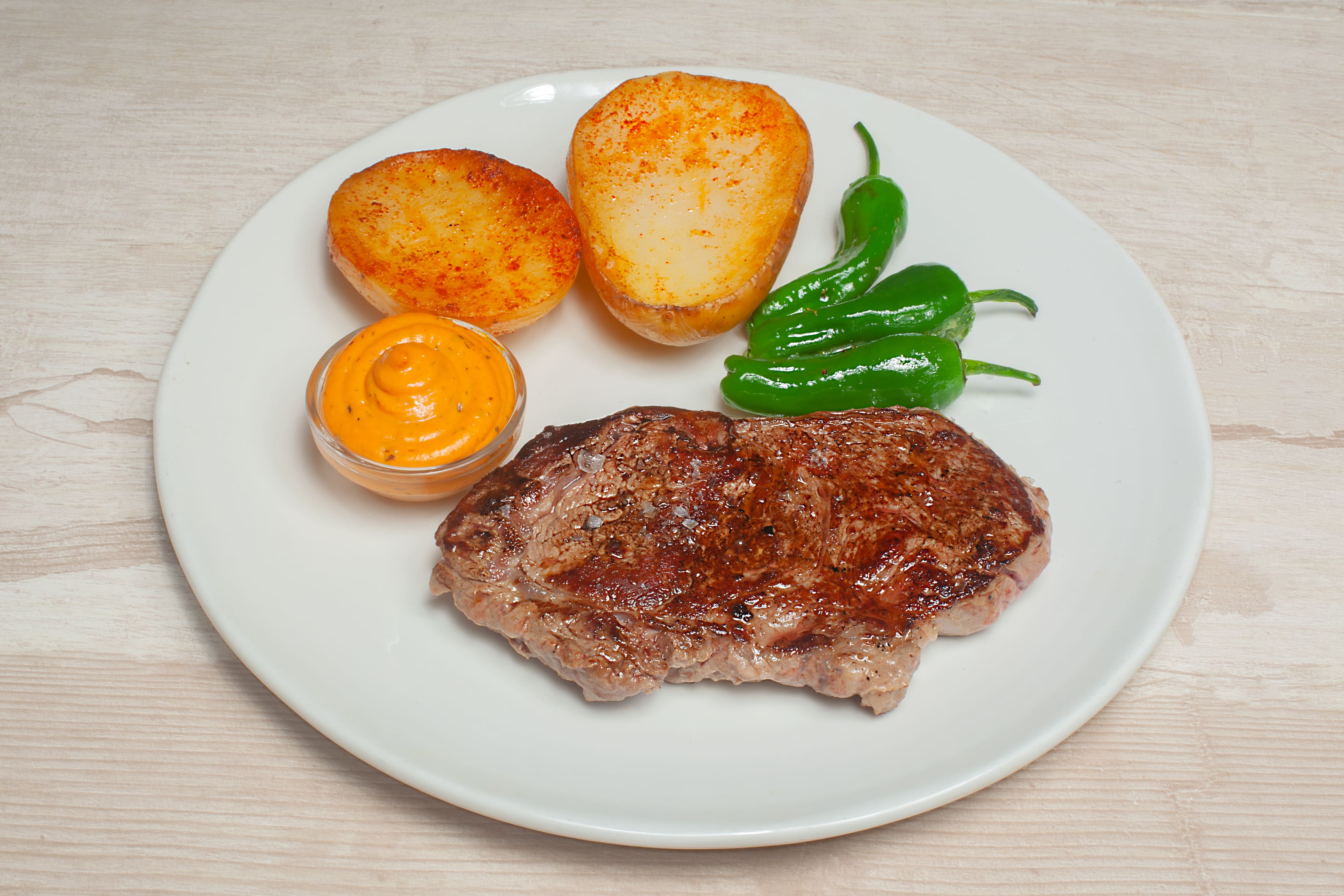 Corte de carne de cerdo a la plancha, acompañado de puré de patatas con salsa Pedro Ximénez